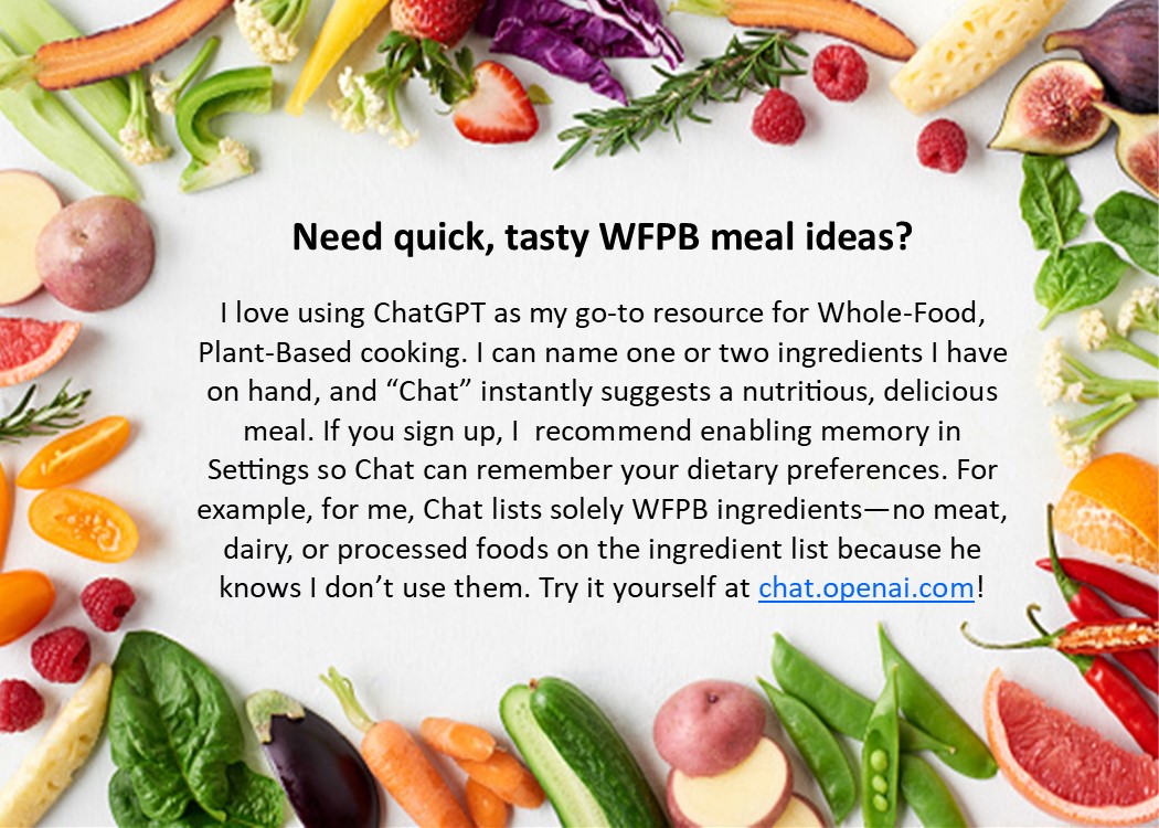 I hope you will seek out plant-based potluck dinners in your neighborhood or maybe plan one yourself. Sharing ideas and good food is so rewarding and fun! Please keep in touch. [Note: If I don’t respond to you within 24 hours, please call or text me to let me know, because Yahoo is currently not delivering all of my emails.]