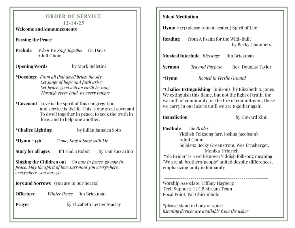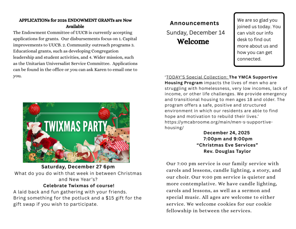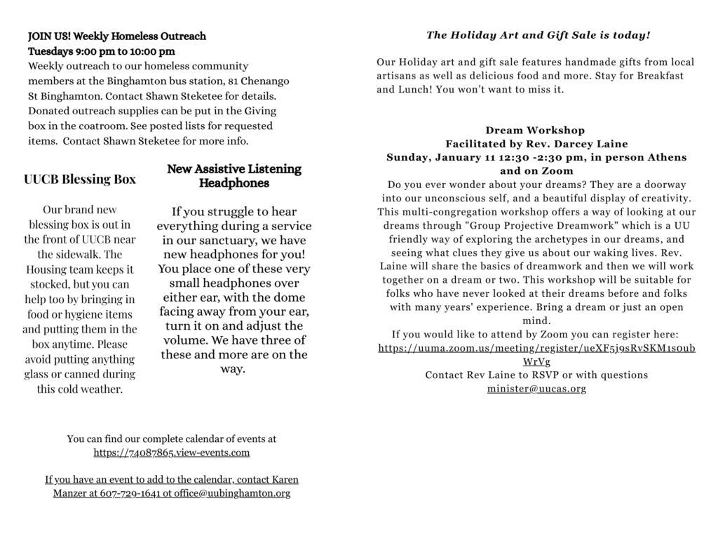Find out about all that is happening at UUCB! Watch for twice a week emails, check out our Facebook group (UUCB Members and Friends) and our public Facebook page. There is a monthly newsletter, The Beacon, available too. There are printed copies of the newsletter in the wall file outside the office and at the info desk, or you can request that a copy be mailed to you at home by asking Karen in the office. Also, check out our calendar of events by clicking the “News and Events” button on our website.